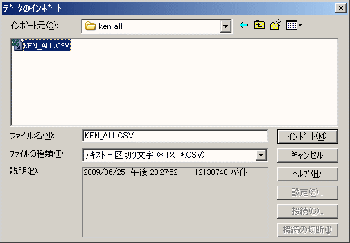 それでは、郵便局のホームページからダウンロードして解凍した、KEN_ALL.CSVをこれから、アプローチ側でインポートします。